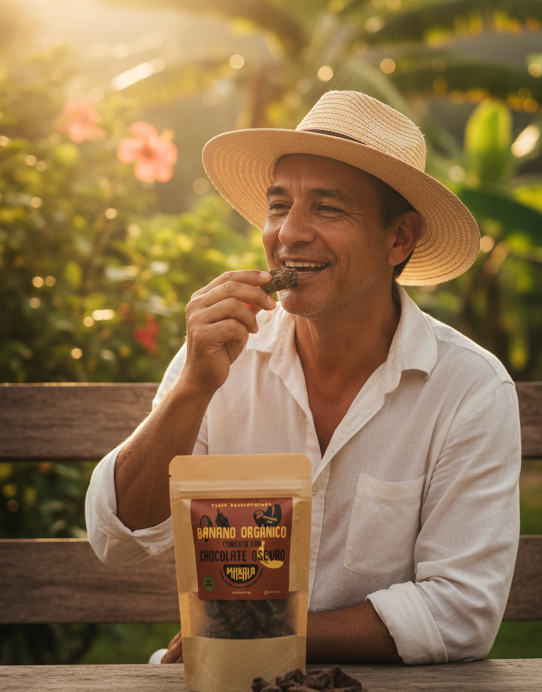 Rodajas de banano orgánico deshidratado, cubiertas con chocolate oscuro 65%, hechas con ingredientes reales y sin complicaciones. Un snack delicioso que combina lo natural de la fruta con el sabor intenso del cacao.